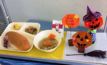 今日の給食に、旬のさつまいもを使った手作りデザート「スイートポテト」が出ました。バターやクリームを使っているので、乳のアレルギーがある児童は食べられなくて残念でしたが、豚肉と野菜のケチャップソテーやスープなど他のおかずをしっかり食べました。1年生の児童は、「はじめてスイートポテトを食べて、おいしかったよ。」と話してくれた児童が、クラスで10人近くいましたが、時間内に全部食べ終わることができました!10月になったので、給食調理員よりハロウィーンのディスプレイや、おばけ・コウモリなどのラッキーにんじんのプレゼントがありました。