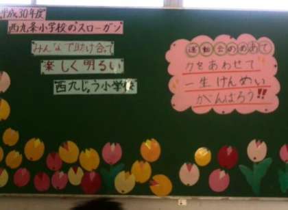 高学年の代表委員会の児童が、校舎の窓にスローガンを掲げ、みんなが力を合わせてのぞめるように、活動をしています。西九条小学校の子どものパワーを出し切りましょう。