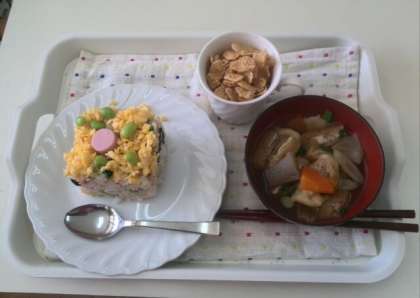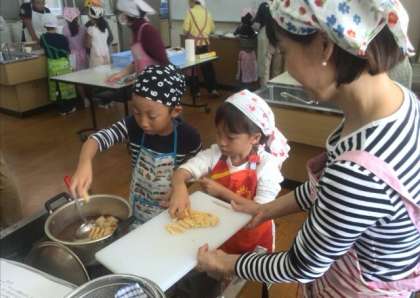 10日の土曜日に、生涯学習ルームの主催による食育教室「キッズ・クッキング」がありました。家庭科室が満員になるほどの大盛況で、親子で「デコレーション寿司、すいとん、あずき入りシリアル」のメニューを調理していただきました。