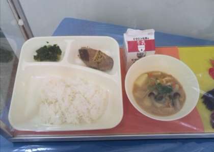 今週は海のものを使ったメニューが多く登場しました。今日は「なまりぶしのしょうか煮」。鉄分などのミネラルがたっぷりの血合い肉も多く、1年生の児童は「ここ、食べられる?ちょっと苦いで!」と言いながら、筋肉をしっかりと作る栄養たっぷり、と栄養教諭の話を聞いてチャレンジしました。焼き物機でジューシーにふっくらと煮えていましたから、学校全体407食分のうち、ほんの1人分しか残りませんでした!