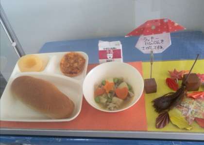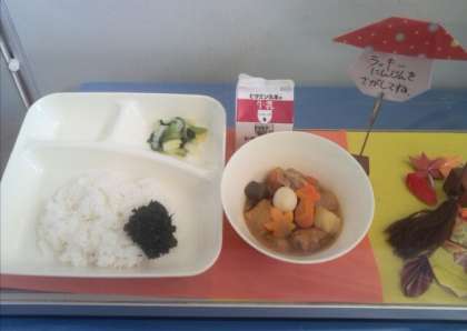 昨日は関東煮にちくわが入っていて、ラッキー人参のもみじの形とマツタケの形が秋らしかったです。ごはんのおともによくある「のりのつくだ煮」も、だしを取り、のりを煮て手作りしていますので、無添加で甘すぎず、うす味に仕上がり、おかわりの希望者が多かったです。