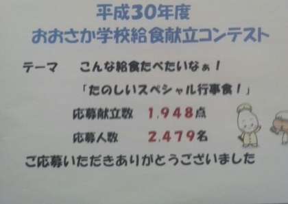 本校児童の献立が、平成30年度大阪府学校給食献立コンテスト5年生の部で、入賞しました。大阪府下の小学校5、6年生2000人以上の応募があった中、5年生の部入6献立の中に入りました!本校5年生でチャレンジしたのは1名だけでしたが、家の人とアイデアを出し合い、素敵なメニューを考え、6年生の児童と一緒にがんばって試作しました。