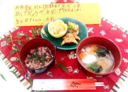 献立は、行事献立が課題で「お赤飯 かん国・朝鮮風ぞう煮 あげギョウザ 祝!!門松ちくわ 紅白ナムル 牛乳」でした。
