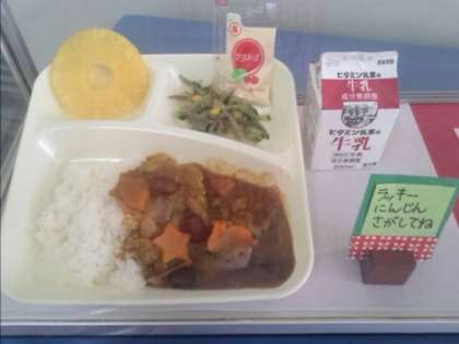 火曜日は金時豆がたっぷり入ったカレーライス。食物繊維や鉄分がたっぷりです。星やうさぎの形のラッキーにんじんが入っていました。