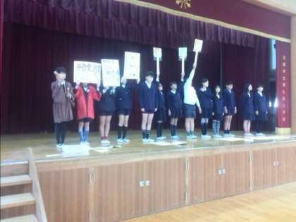 朝の児童集会で、健康委員会の児童が「給食週間ぐーちょきぱークイズ」をしました。今年から新しく登場した給食のパン「おさつパン」や、給食のごはんがどこから運ばれているのかなど、子どもたちは楽しんでクイズに参加していました。