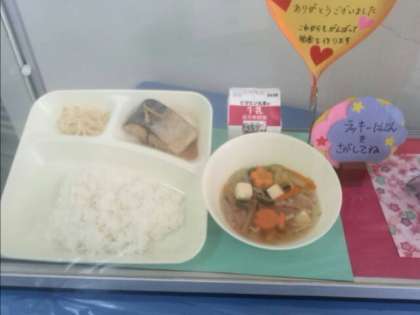 今日の給食メニューは、「さばのみそ煮」。1年生は骨をとるのに四苦八苦している児童もいましたが、おはしを上手に使ってきれいに骨をとっている児童もいました。皮が破れないように、400人分以上のさばを上手に煮上げていただいたので、おかわりする児童も多く、よくたべていました。五目汁には魚や花の形のラッキーにんじんが入っていました。