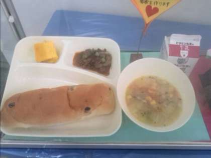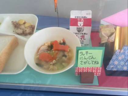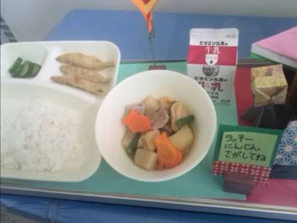 今月もおいしいメニュー満載でたくさんのラッキーにんじんもありました。もち米から蒸して手作りした「中華おこわ」の日は、お散歩ポーズのワンちゃんとハリネズミの形、魚を丸ごと食べられる「きびなごてんぷら」の日にはおすわりワンちゃんとうさぎの形のラッキーにんじんが入っていました。今日は手作りのデザート「かぼちゃのプリン」がでました。