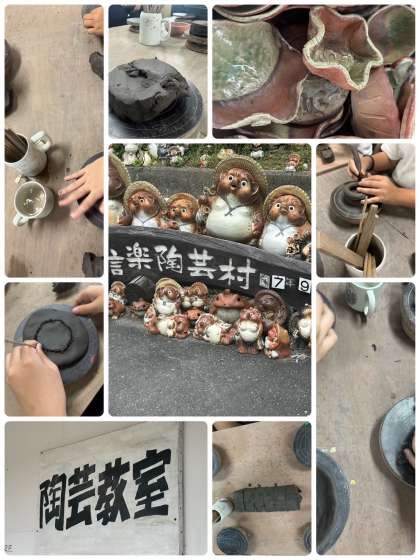 信楽陶芸村に着いて、陶芸体験を楽しんでいます。どんな作品が出来上がるのか、お楽しみに!