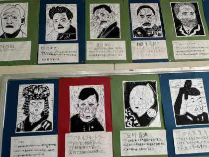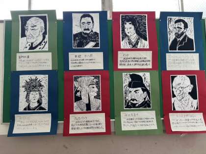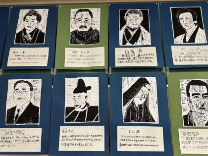 「歴史上の人物」版画が完成しました。顔の筋肉の向きや細かい装飾品なども工夫して彫ることができました。