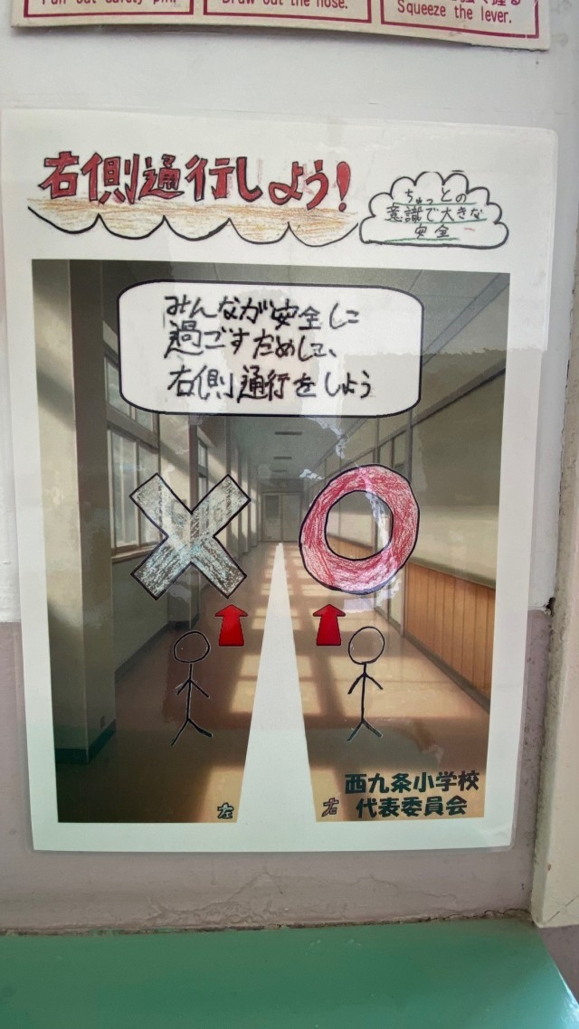 西九条小学校のみんなが校舎内で右側通行をし、廊下や階段を走らない習慣が身につくように、代表委員会が「右側通行名人」の取り組みを始めました。
