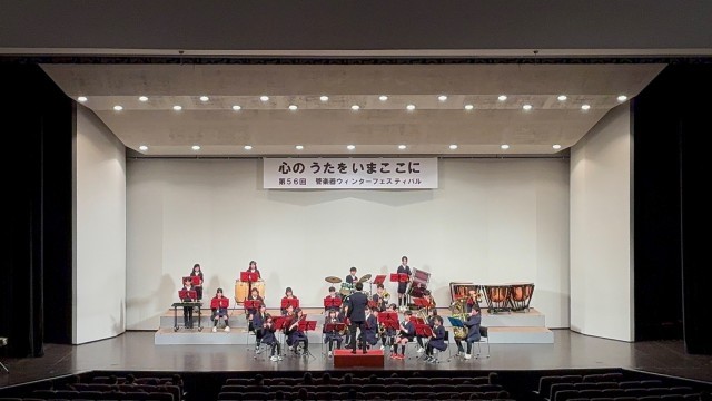 「第56回管楽器ウィンターフェスティバル」です。演奏した曲は、Mrs. GREEN APPLEの「ケセラセラ」と「マツケンサンバⅡ」です。ノリノリに楽しく演奏することができました。
