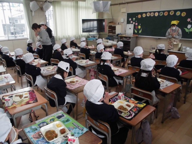 1年生が待ちに待った給食を食べました。まずは、ルールやマナーの学習です。