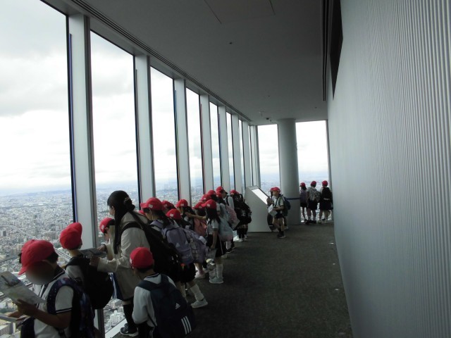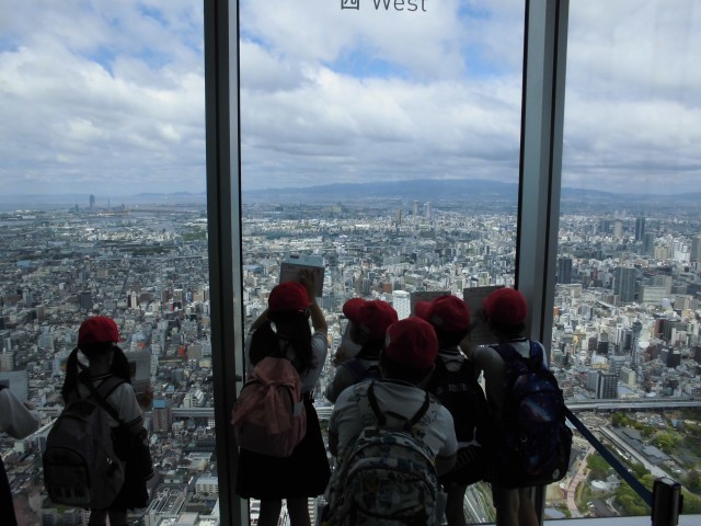 あべのハルカスの60階から大阪のまちの様子をみました。東西南北それぞれの方向で見つけたものをメモしながら、グループで活動しました。