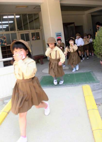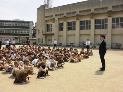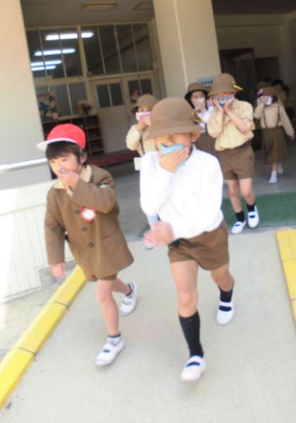 1年生は、はじめての避難訓練でしたが、ハンカチで口を押え、静かに運動場へ集まることができました。