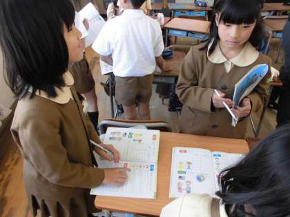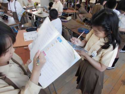 今日は英語のアズリー先生に来ていただき、英語の授業をしました。友達の好きなものを英語で聞きあいました。ほかにも英語の歌を歌ったり、数字の言い方を学習して楽しく英語を学びました。