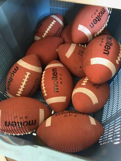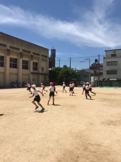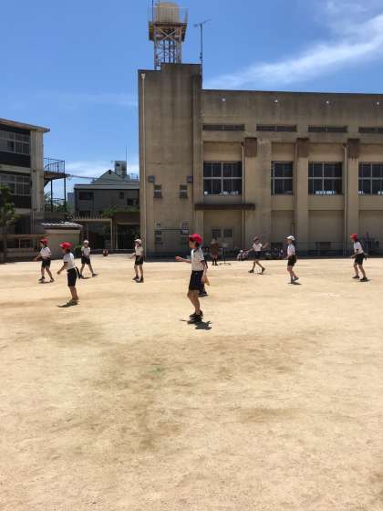 体育でスペースボールという、タグラグビーのルールを簡単にした競技をしています。前にボールを投げても大丈夫です。みんな必死にボールを追いかけています。運動場にはとても爽やかな風がふいています。