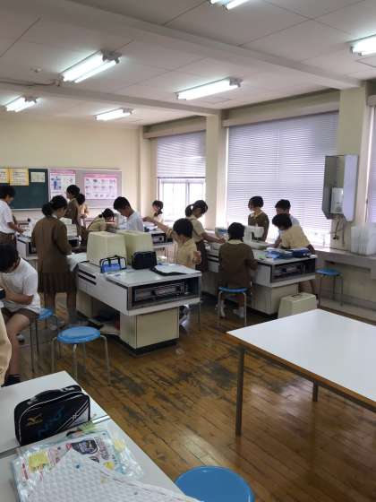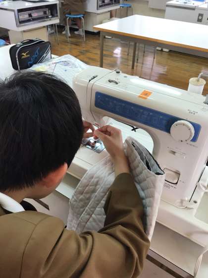 家庭科で修学旅行に持って行く、ナップザックを作っています。今日はミシンを使いました。