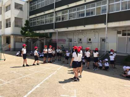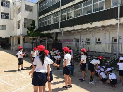 1年生と一緒にスポーツテストのソフトボール投げをしました。赤帽が6年生です。ボールを渡したり、声をかけたり、優しく接していました。6年生が見本で投げると1年生から歓声があがりました。