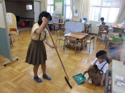 たてわり集団で清掃活動に取り組むことによって、異学年の交流を図り、励まし合い助け合って、よりよい仲間づくりができることが目的です。