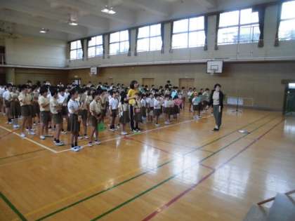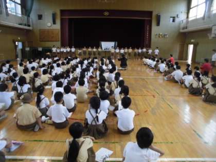 まずはじめに、去年から練習をしていた、4年生が全校児童の前でお手本を発表してくれました。足を鳴らしたり、ピタッと止まるところがあったり、とても迫力のある発表でした。
