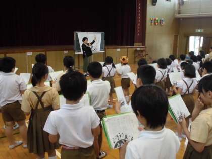 先生が前に立ち、練習しました。初めての群読にも関わらず、四貫島の子どもたちは上手に合わせることができていました。