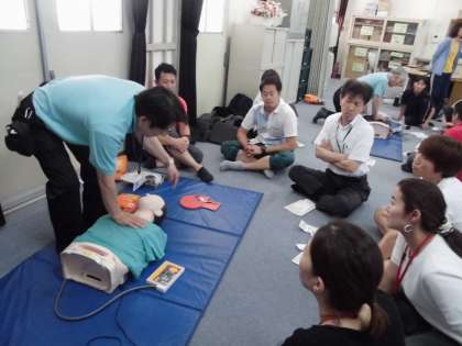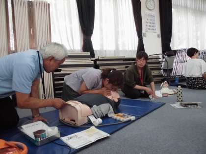 AEDが普及した昨今,水の事故だけでなく,病気や事故による心停止・呼吸停止など,万一の事態に備え,みなさん真剣に取り組みました。