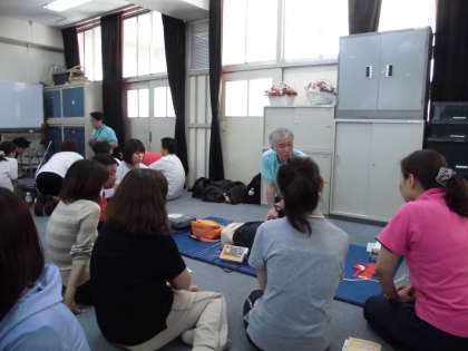 今月20日からプール水泳が始まります。プール水泳開始に伴い,教職員・保護者を対象に心肺蘇生法講習会を実施しました。