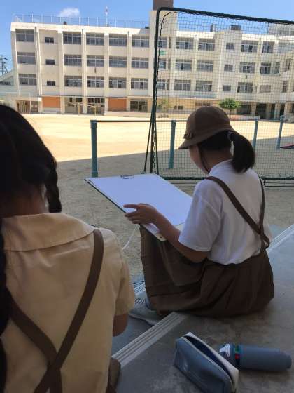 わたしたちの風景を写生して思い出に残します。学校での好きな風景を選んで描きます。鉛筆での下書きが終わりそうです。