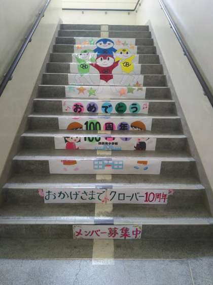 階段をあがると、パーっと広がる100周年おめでとうの掲示に、6/23(日)の朝、はじめて階段を上がっている子たちからも「わー!すごい!」と歓声があがっていました。