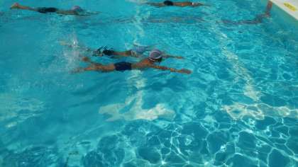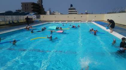 低学年は43名の参加でした。うでをまっすぐにしたけのびを練習していました。バタ足ですいすい泳ぐ子も多かったです。最後は、夏休みならではの自由タイム!キャー♪ワーッ☆と歓声が響いていました。
