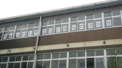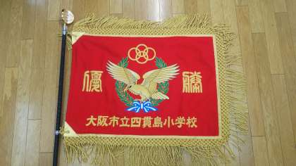 この度、創立百周年記念事業で、運動会の優勝旗を新しくしていただきました。黄金の刺繍がまぶしいくらいに輝いています。ありがとうございました。