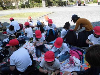 オリエンテーリングのゴールは、西の丸庭園。そこで大阪城をバックに各班ごとに写真を撮りました。