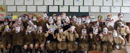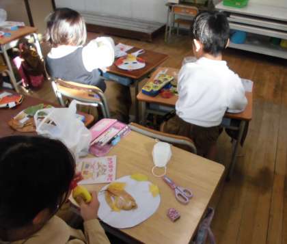 マラカス、けん玉、まといれ、やじろべえ、こま、おめんなどをつくっていました。