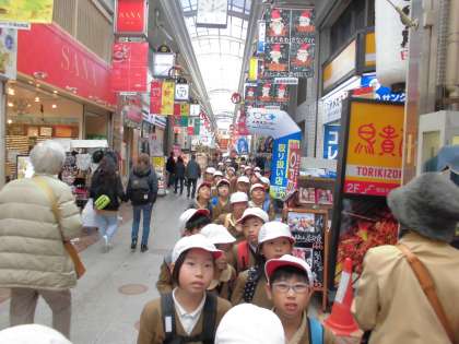 帰りには日本一長い「天神橋筋商店街」を通りました。10分くらい歩いても、まだまだ続く商店街に「へー。さすが日本一」と感心しました。