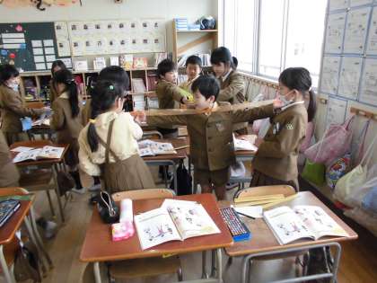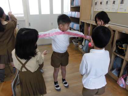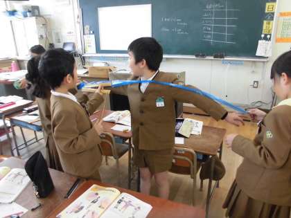 腕をまっすぐ横に伸ばした長さをはかり取り、何cmになるのかをものさしで調べました。1学期に学習したものさしの使い方を、しっかり覚えていました。来週から、新しい単位を学習します!