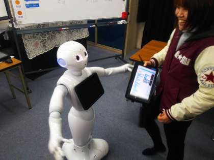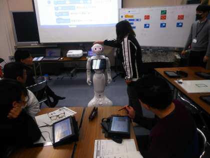 来年度から始まるプログラミング学習に向けて、(株)ライト通信 加々本様をお招きし、校内研修をしました。ソフトバンクのペッパーを使って、将来の生活を想像しながら学びました。