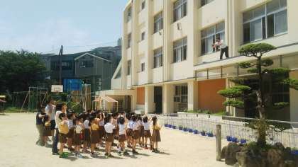 1年生:はい!チーズ!と写真を撮っています。入学式のスライドで流す写真をお楽しみに!