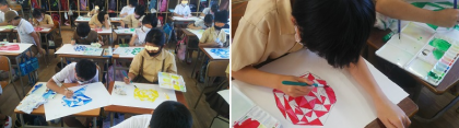 2・3時間目:4年生が図工「わたしの宝石」で色づくりをしています。一筆一筆ていねいに塗っています。