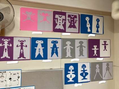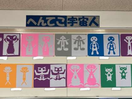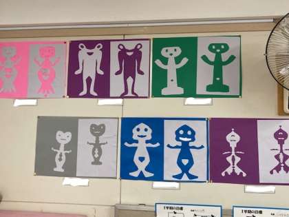 図工科では、上手にはさみを使い、『へんてこ宇宙人』を作りました。ギザギザな線や曲線などを駆使し、個性あふれる作品が出来上がりました。どの作品も愛嬌があり、見る角度や距離によってかっこよく見えたり、可愛らしく見えたり、とても楽しいです。