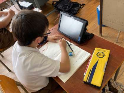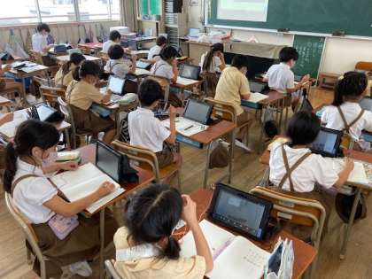 学校が再開してから、少しずつICT機器を使っての学習に取り組んでいます。パソコンで時間割作りをしたり、タブレット端末で写真を撮ったり、何事にも積極的に挑戦する姿がとってもステキです。