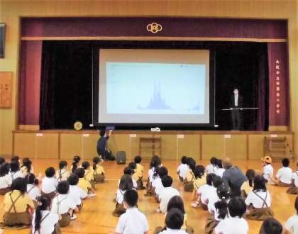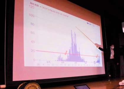 子どもたちにわかりやすいように、棒グラフを大きなスクリーンに写して出して、説明されました。グラフを見ただけで、何を表したグラフかわかると手を挙げている子どもも少なくありませんでした。