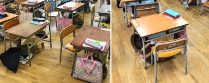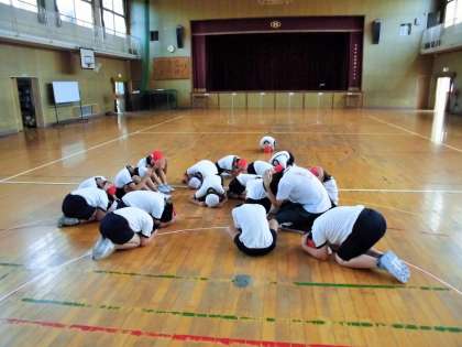 本日は大阪880万人訓練に合わせて、身の安全を守る訓練をしました。ちょうど休み時間だったので、「休み時間のときに地震がきたらどんな行動をとればよいでしょうか」と各学級で「身を守る姿勢」について考えました。