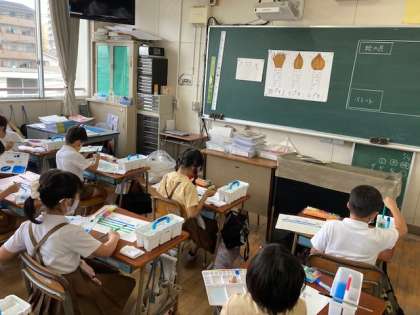 図工科の学習で、初めての絵の具に挑戦しました。絵の具の学習の時の用意の仕方や筆の洗い方、片付けの仕方など、覚えることはたくさんですが、集中して取り組むことができました。