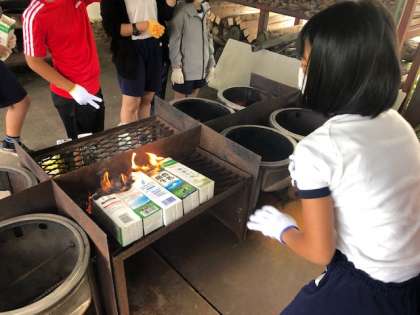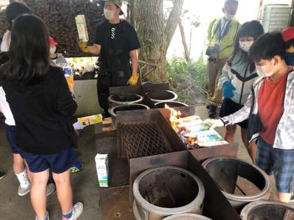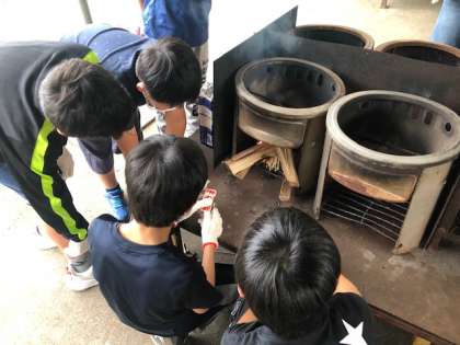 牛乳パックに詰めたカートンドッグを、外の炊飯場のかまどで焼いていきます。