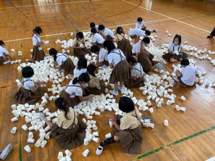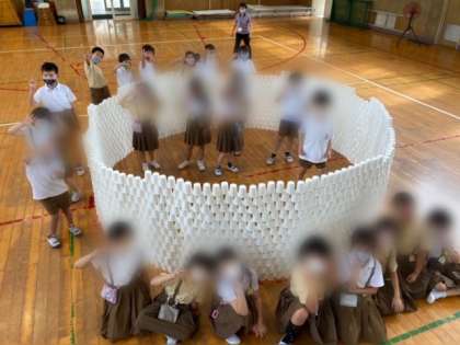 図工科の学習で、紙コップワールドを行いました。講堂を広く使って、まずは、1人で思い思いに紙コップを積み上げました。グループでは、協力して作品を作る姿が見られました。最後には、全員で協力して大きな作品を仕上げました。