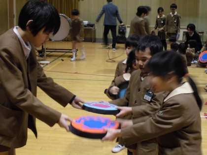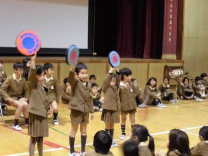 5年生は,一生懸命がんばったキッズマート,楽しかった林間の感想を発表しました。全員で「キリマンジャロ」の演奏もしました。またキッズマートで出た利益でニュースポーツの「ドッジビー」というフリスビーに似たものを各学年にプレゼントしました。