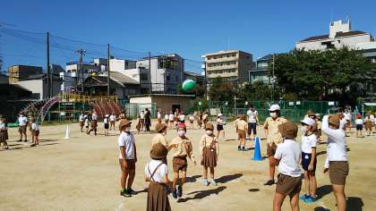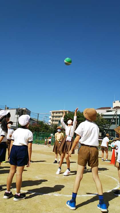 今秋も15分休憩に、ボールタイをしました!たてわり班で仲よく身体を動かします。
