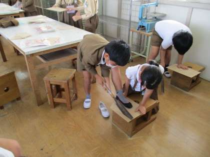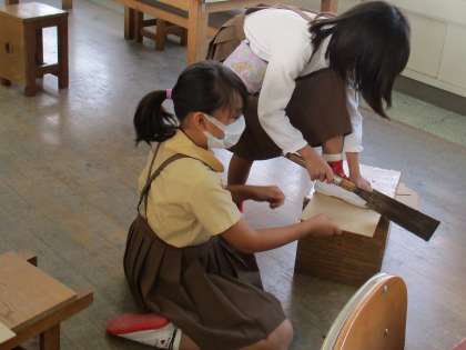 図工でのこぎりに挑戦しました。板をギコギコ。初めは怖がっていたけれど、だんだんコツをつかんできて、うまく切れるようになってきました。友だちのサポートもばっちりです。