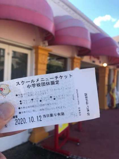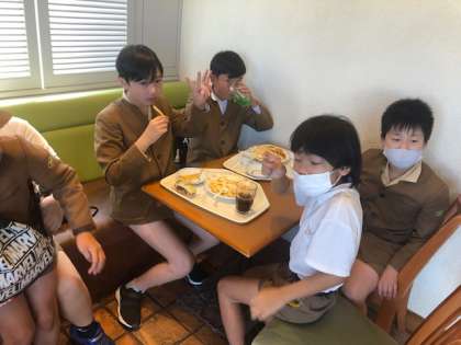 遊びの合間に班ことに昼ごはんです。チケットが使える店を班で選んで、好みのメニューをそれぞれが注文します。