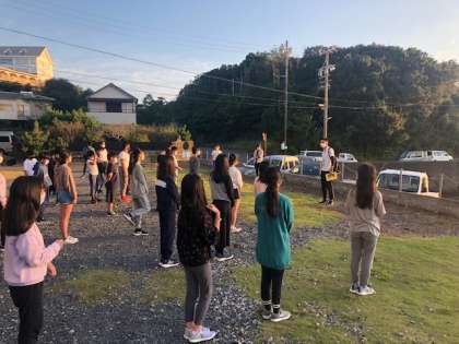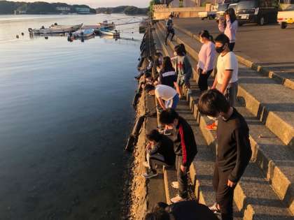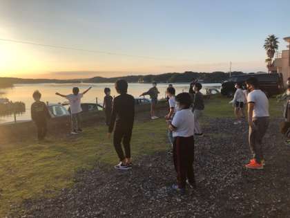 宿舎から出て、朝の会をしました。眠そうな顔でラジオ体操をする子どももいました。朝食まで朝の海辺を散策して楽しみました。